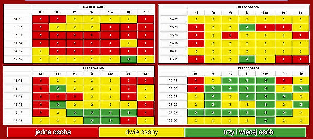 Publikujemy aktualne zgłoszenia na dyżury w Kaplicy Wieczystej Adoracji. Jak widać, nie ma już ani jednej godziny, na którą nikt się nie zgłosił. Jest to ogromna radość, ale dużo jest godzin, na które zapisały się tylko pojedyncze osoby. Zachęcamy tych wszystkich, którzy jeszcze się nie zapisali, aby to zrobili w najbliższych dniach – najlepiej w godzinach, w których zadeklarowała dotąd swoją obecność jedynie jedna osoba (zaznaczone czerwone pola). Zapisać można się też online na stronie https://adoremustechriste.pl/poznan-winogrady albo telefonicznie u 4 koordynatorów: